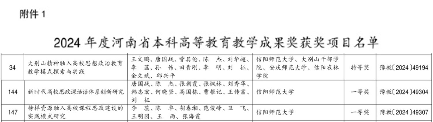 教师参与申报成果《大别山精神融入高校思想政治教育教学模式探索与实践》荣获特等奖,唐国战院长主持成果《新时代高校思政课话语体系创新研究》,李蕊教授主持成果《榜样资源融入高校课程思政建设的实践模式研究》分别荣获本科高等教育教学成果一等奖。