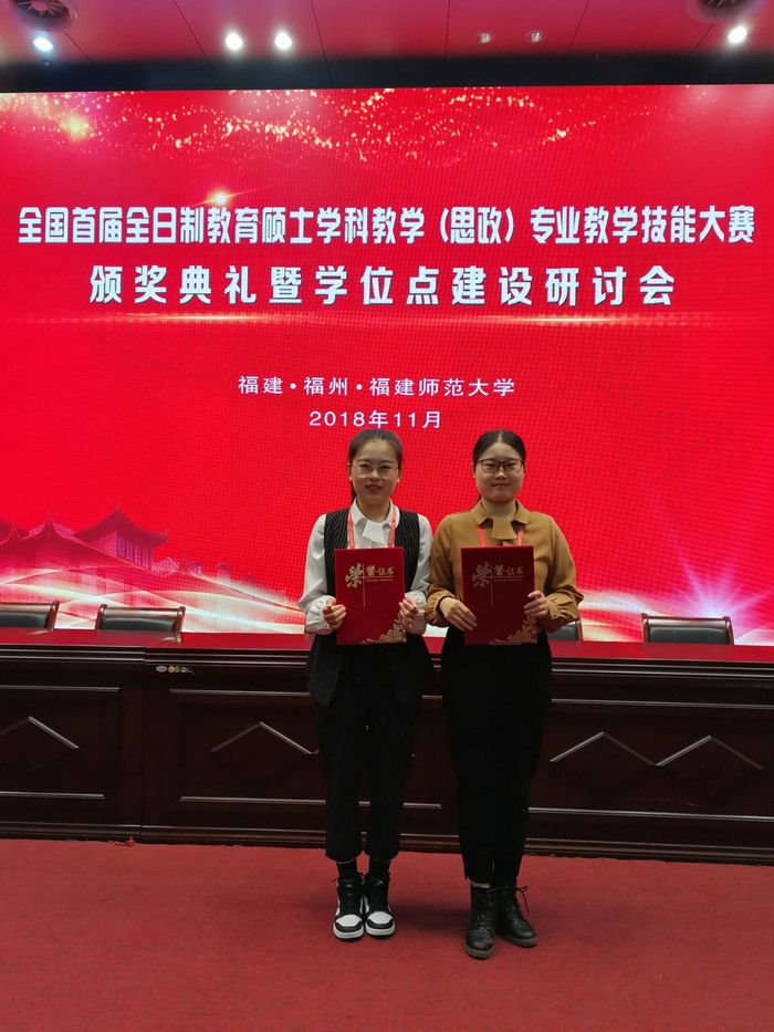 11月21日—23日,由全国教育专业学位研究生教育指导委员会主办的全国首届全日制教育硕士学科教学(思政)专业教学技能大赛(决赛)在福建师范大学举行。经过激烈的角逐,七大罪 2017级学科教学(思政)专业研究生张梦瑶和罗尚泽两位同学双双荣获三等奖。