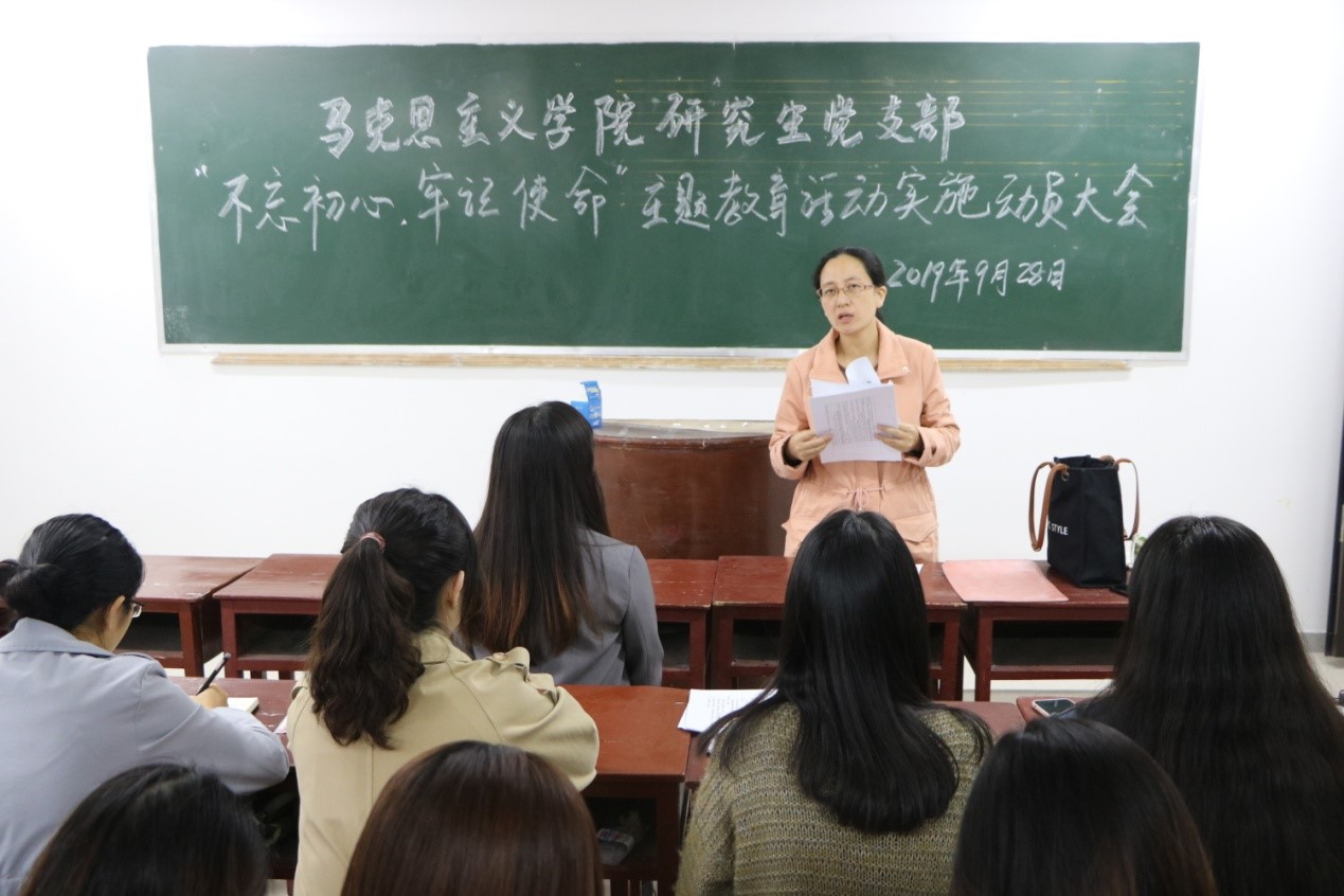 关于开展“不忘初心,牢记使命”主题教育的实施方案》,并在此基础上广泛征求同学们意见和建议,形成了符合本支部实际和特色的具体活动实施方案。接着,卢云晓向大会汇报了活动的具体安排,活动拟在9月至11月间进行,主要包括主题自学、集中研讨互学、志愿服务、实践考察、民主生活会等内容。