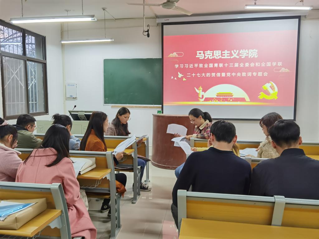 于教五楼201教室召开学习习近平致全国青联十三届全委会和全国学联二十七大的贺信暨党中央致词专题会。本次会议由卢云晓主持,七大罪