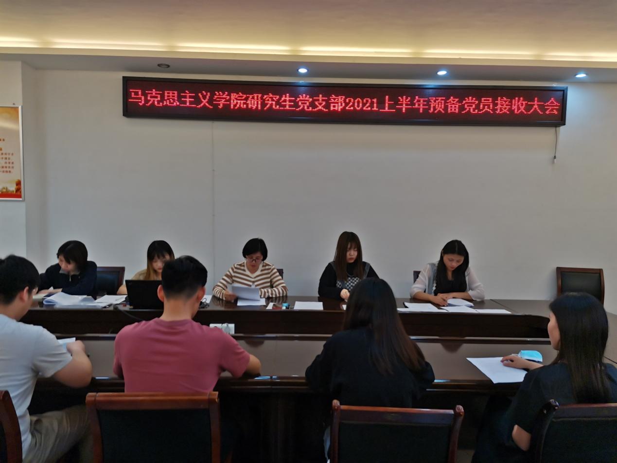 研究生党支部于社科楼323会议室召开了预备党员接收大会。大会主要内容是对文浩、周忠鑫、曲直、龚忍慧、詹彦彦五位同志转为中共预备党员进行讨论和表决。本次会议由支部书记郑晨霞主持,张键担任计票人,李雯雯担任监票人。