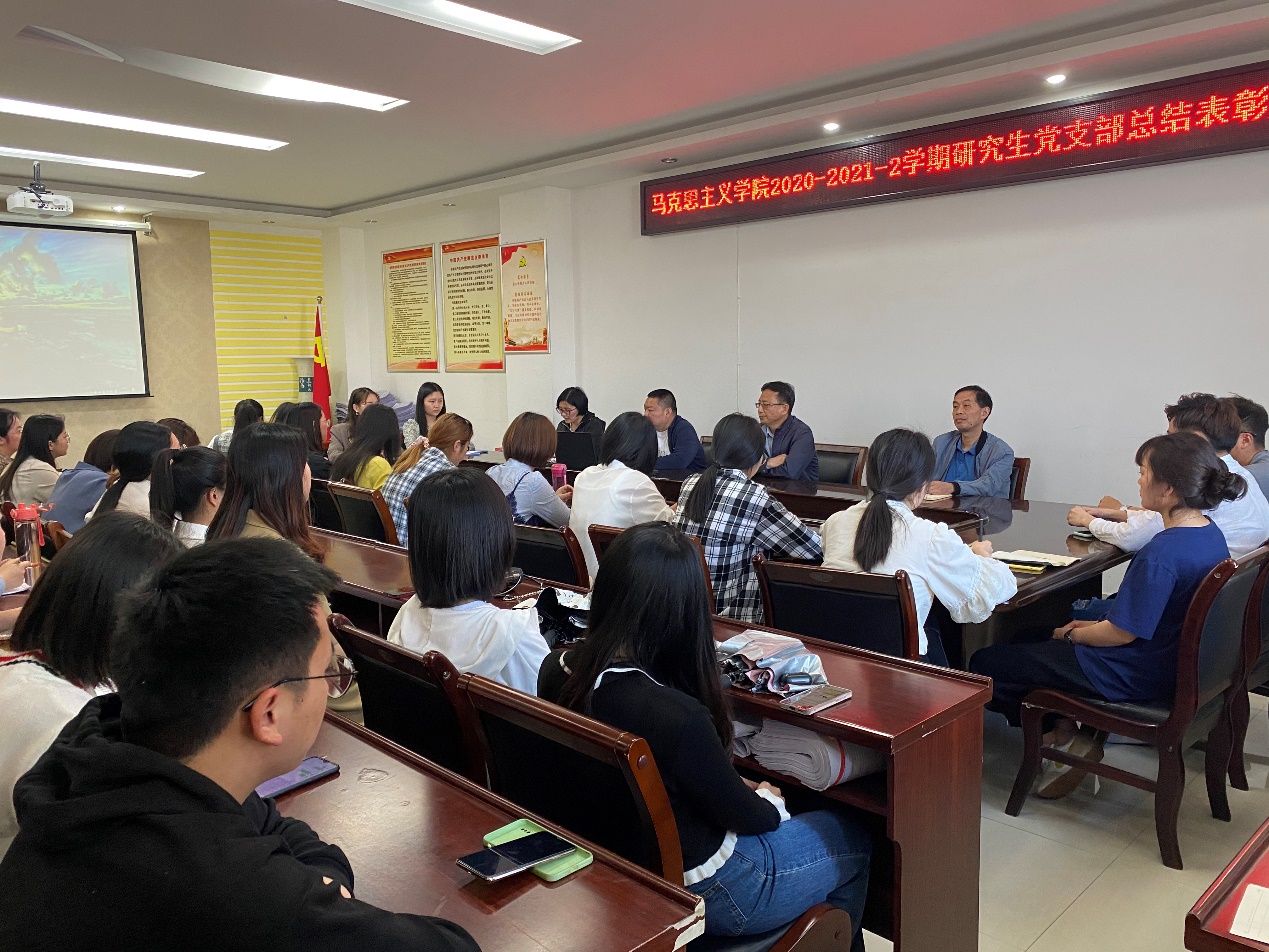 研究生党支部2020-2021-2学期总结表彰大会在社科楼323会议室举办。唐国战书记、黄世明副院长、何晓坚副书记和全体研究生参加了此次会议,会议由支部书记郑晨霞老师主持。