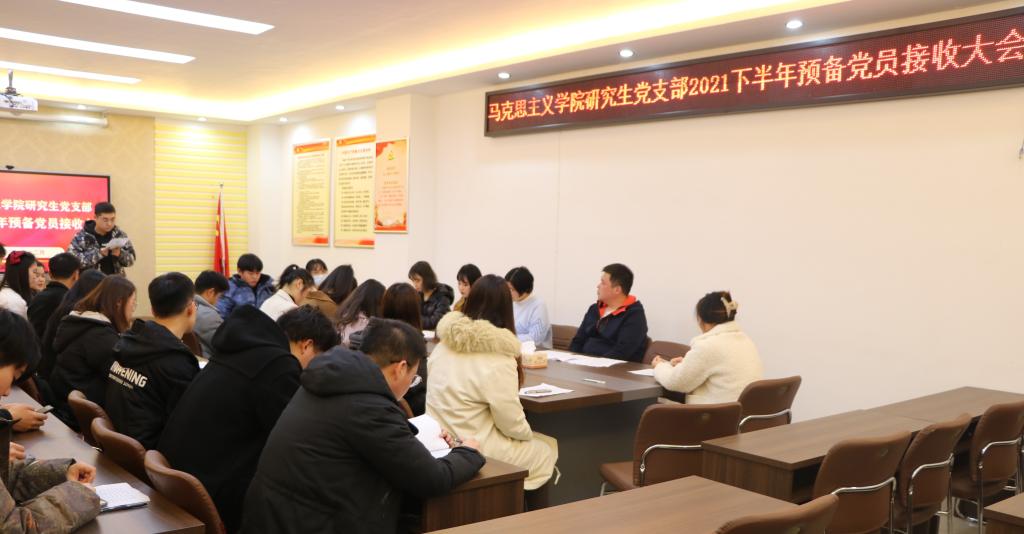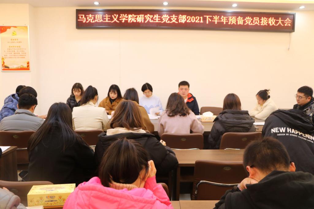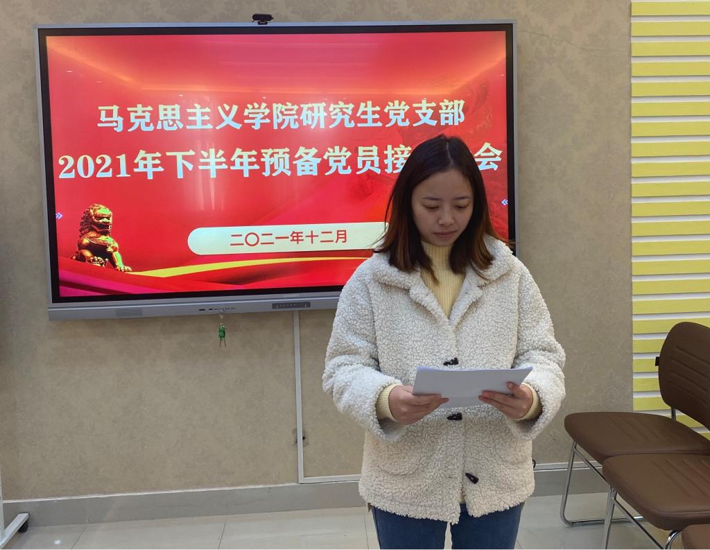 研究生党支部于社科楼323会议室召开2021下半年预备党员接收大会,讨论了王浩、李婷婷、余海玲、张丹雅、张紫鑫、周韵诗、孟祥琳、郭倩、崔浩婷、樊悦十位同志转为中共预备党员的问题。本次会议由支部书记郑晨霞主持,监票人由宣传委员李胜担任,计票人由小组长王澳远担任。