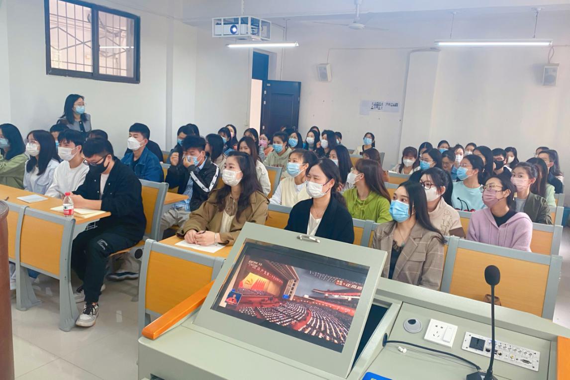 组织在校研究生在教五201教室观看开幕会盛况直播。