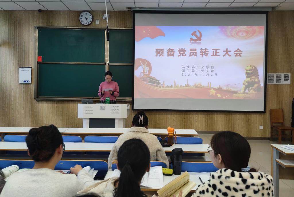 本次会议严格按照党员转正程序开展,认真讨论了贾思琦、耿晗、姜雨杭、李静、席妞五名同志转为正式党员的申请。首先,五名同志依次宣读了转正申请,以及在预备考察期内自己在思想认识、专业学习、生活情况等各方面的现实表现和主要优缺点,表明了加入中国共产党的态度和决心。接着,组织委员黄子晋同志就一年来对五名预备党员的教育和考察情况进行介绍,并就是否同意他们成为正式党员提出意见。随后,全体党员进行不记名投票,贾思琦等五名预备党员全票通过。接着,党支部书记曹梦真宣读本次支部大会转正决议,并对本批转正党员同志提出希望和要求。最后,杨康对本次会议作出总结,他表示五名同志要谨记入党誓词,牢记使命担当,以更加严格的标准来要求自己。