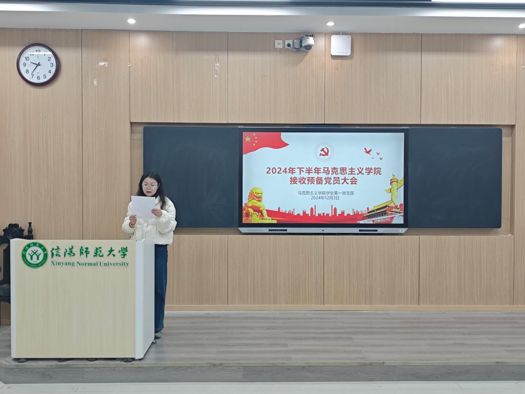 会议严格按照党组织接收预备党员的程序进行,共有十项议程。首先,余浩洋清点到会人员并宣读党员发展对象名单。随后,许竞文、刘鑫琰、刘英凯、李佳茹四名同志宣读《入党志愿书》,汇报自己对党的认识、入党动机、本人履历、现实表现、家庭和主要社会关系情况,表达了加入共产党的决心。接着,入党介绍人高小佳同志简要介绍申请人一年来的表现、教育和考察情况,并就是否同意他们成为预备党员提出意见。随后,与会党员进行投票表决。经支部表决,一致同意接收许竞文、刘鑫琰、刘英凯、李佳茹四名同志为中国共产党预备党员。最后,党支部书记高小佳同志总结发言,不仅对四位同志表示热烈祝贺并提出殷切希望,而且鼓励所有正式党员和预备党员不断提高自身业务素质和党性修养,真正起到先锋模范作用,为学校发展贡献力量、为党旗增辉添彩。