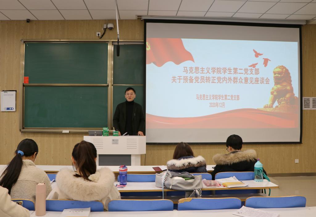 学生第二党支部书记曹栋,支部正式党员陶青青、曹梦真,第二党支部预备党员以及党外群众共同参加此次会议。会议由曹栋主持。