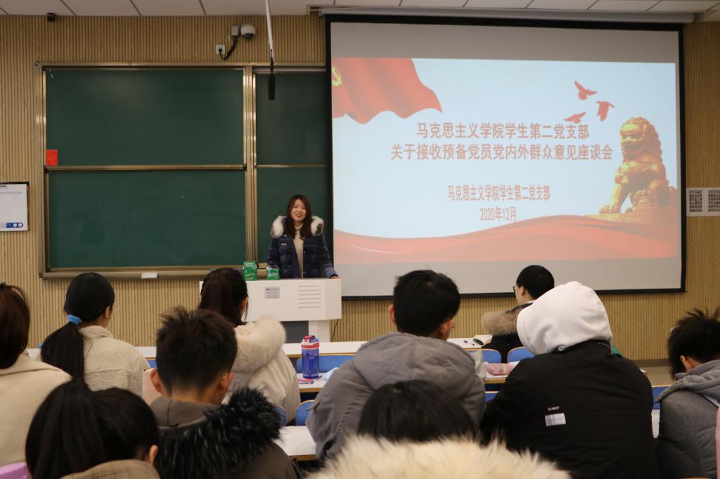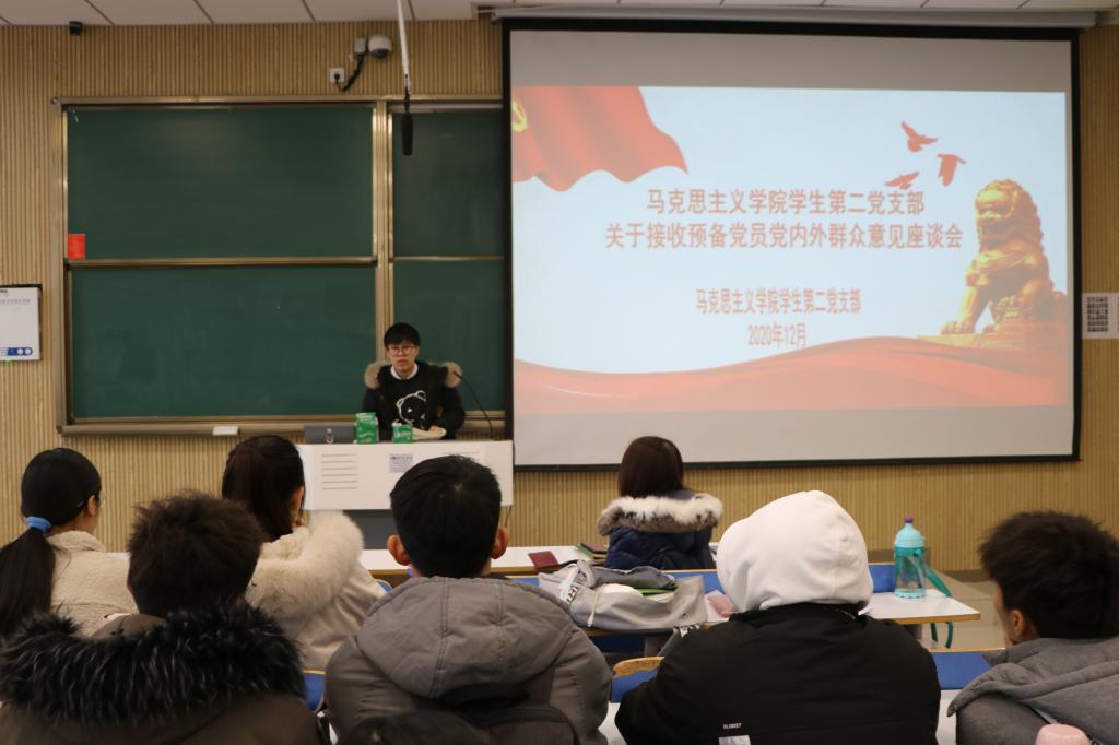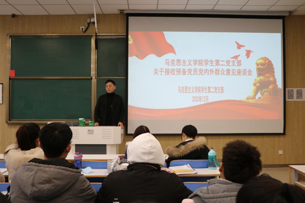 学生第二党支部书记曹栋,支部正式党员陶青青、曹梦真,党员发展对象以及党内外群众共同参加此次座谈会。会议由曹栋主持。