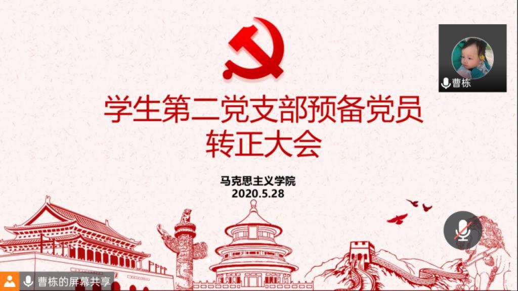 学生第二党支部在网上顺利召开了预备党员转正大会,大会讨论关于张雅琼等4名预备党员申请转为正式党员的事宜。学生第二党支部支部书记曹栋、入党介绍人陶青青、杨胜利、全体党员和预备党员共28人参加了此次会议。会议由曹栋主持。