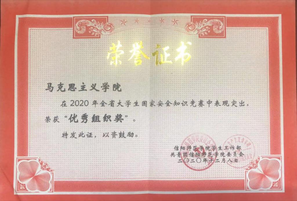 在学校举办的2020年全省大学生国家安全知识竞赛中积极参与、表现突出,荣获“优秀组织奖”。
