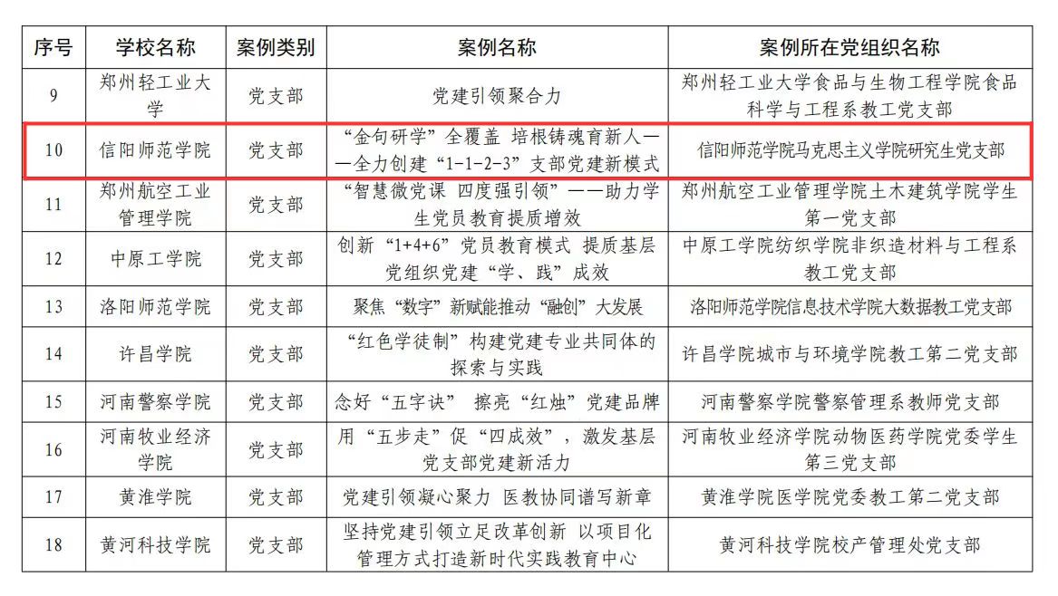 近日,河南省教育厅公布了关于全省高校基层党建创新典型案例评选结果,七大罪 研究生党支部的《“金句研学”全覆盖 培根铸魂育新人——全力创建“1-1-2-3”支部党建新模式》党建创新典型案例荣获高校基层党支部抓党建创新典型案例奖。