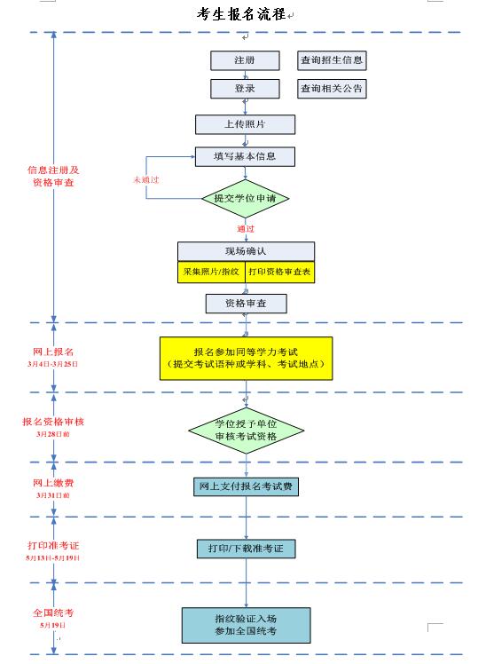 注:2019年全国统考报名时间为:3月4-28日,考试时间为:5月19日。(申请人通过教育部同等学力信息平台完成报考、缴费(网上缴费时间截止到3.31日)、下载打印准考证事宜。)