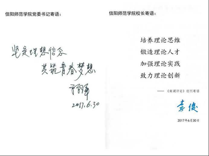 信阳师范学院党委书记宋争辉、校长李俊为《南湖评论》题词