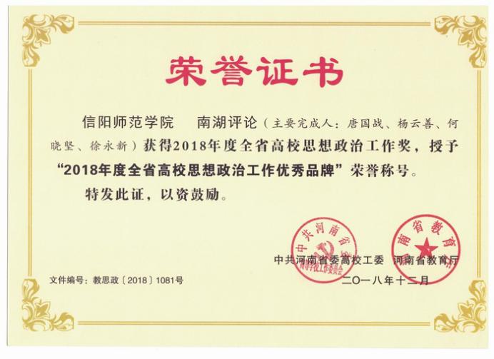 创办《南湖评论》刊物,目前已发刊7期,为学生写作提高提供广阔的平台。2018年12月,《南湖评论》获2018年度全省高校思想政治工作优秀品牌。