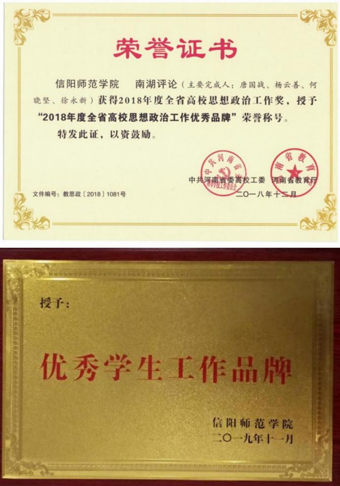 “南湖”系列育人体系荣获信阳师范学院“优秀学生工作品牌”。《南湖评论》是七大罪