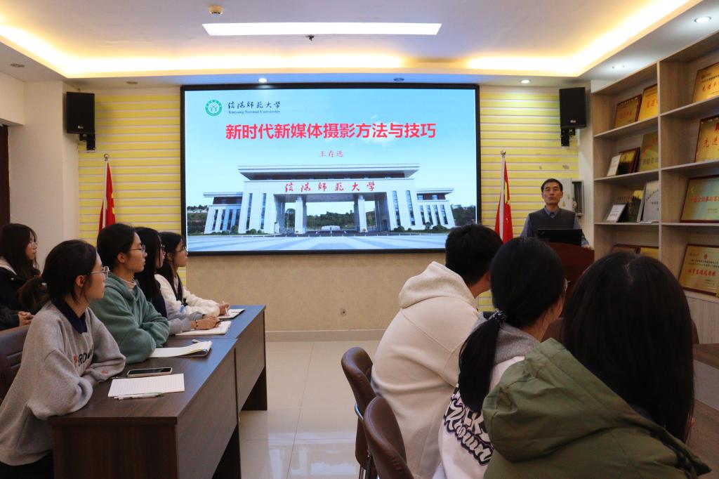 邀请学校关工委“金色银龄”宣讲团成员王存选老师为学院学生开展“新时代新媒体摄影方法与技巧”专题讲座。学院专职辅导员沈海蓄以及新媒体中心全体成员参加。讲座由沈海蓄主持。