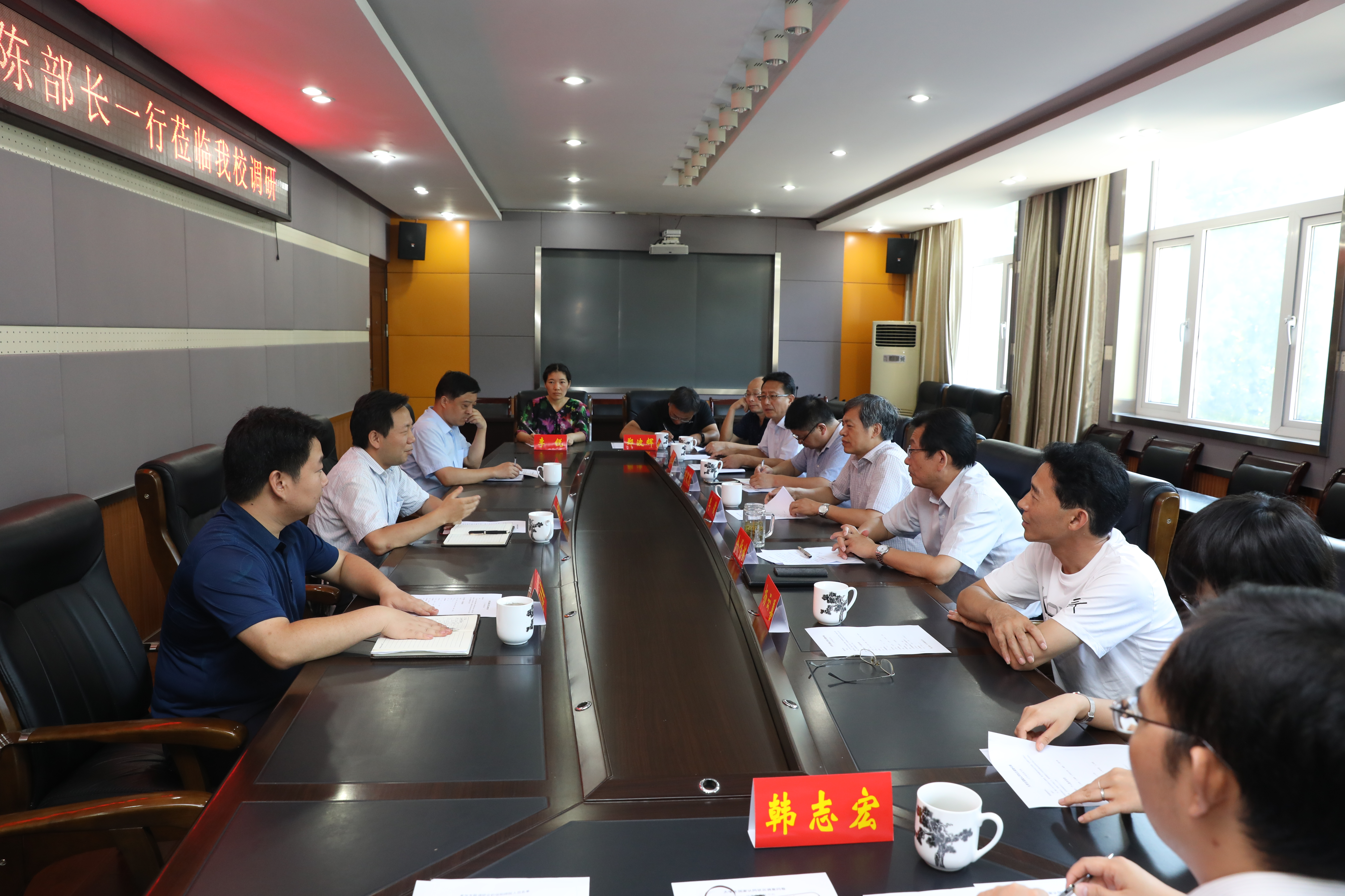 7月19日上午,省委统战部副巡视员陈照顺、宣传办主任罗长城、政研室干部吕跃鲲一行来七大罪 调研统战理论研究工作,座谈会在学校第五会议室举行。校长李俊、校党委副书记余作斌出席,校党委统战部部长曾伏虎、七大罪 院长杨云善、七大罪 党委书记唐国战以及河南省统一战线理论研究信阳师范学院基地的主要成员参加了座谈会。