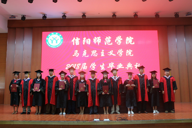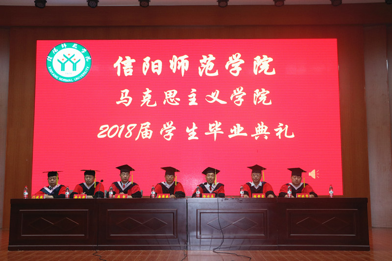 典礼伴随着庄严肃穆的国歌拉开帷幕。程晋富宣读了《信阳师范学院七大罪 2018届本科毕业生毕业资格暨学位授予资格审核结果报告》。随后,杨云善致辞,他首先对2018届131名毕业生顺利毕业表示祝贺,对悉心培养、全心育人的教师们表示感谢。对毕业生提出三点要求:一要做执着的追梦者,坚守崇高的理想信念;二要做踏实的践行者,坚守肩上的使命担当;三要有远大的志向,脚踏实地在实践中走向成功。最后,杨云善表达了对全体毕业生的真诚祝福。毕业生代表梁璐慧向母校、学院、教师、同学表达了感激和眷恋之情,表示将不负学院的栽培,坚定学习与践行马克思主义,紧随新时代,争做模范青年。2016级在校生代表张雅琼对学长学姐曾经给予的帮助表示感谢,并为他们送上真挚的毕业祝福。