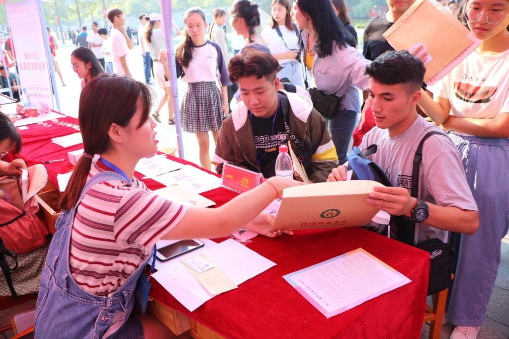 迎新点,在工作人员的引导下顺利完成了报道手续。同时,学院安排了志愿者协助新生完成学费缴纳、宿舍入住以及行李搬运等工作,并调动学生会各部门辅助工作人员服务新生及其家长。