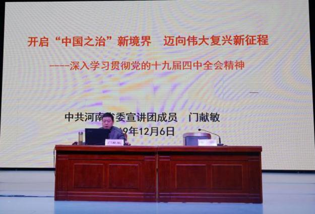 专题宣讲中,门献敏教授以“开启中国之治新境界,迈向伟大复兴新征程——深入学习贯彻党的十九届四中全会精神”为题,着重从“充分认识党的十九届四中全会召开的重要历史意义、深刻理解党的十九届四中全会的鲜明主题、科学把握中国特色社会主义制度的辉煌成就及显著优势、全面理解坚持和完善中国特色社会主义制度、推进国家治理体系和治理能力现代化的总体目标及战略部署、准确把握党的领导是推进国家治理体系现代化的关键和根本、推动党的十九届四中全会精神在信阳大地落地生根”等六个方面作了全面系统宣讲。报告主题鲜明、视野开阔、内容丰富、语言生动,宣讲报告既注重理论的深度、也有生动的事例。门献敏教授的宣讲报告受到基层党员干部和高校师生的良好赞誉,既完成了政治宣讲任务,也扩大了七大罪