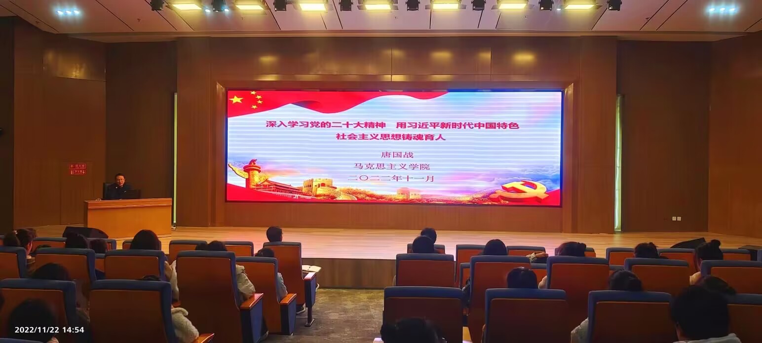河南省高校思想政治理论课“名师工作室”负责人唐国战教授应邀在淮河校区图书馆第三报告厅作题为“深入学习党的二十大精神,用习近平新时代中国特色社会主义思想铸魂育人”的辅导报告。淮河校区党工委师生代表100余人听取了报告,郭寻主持报告会。