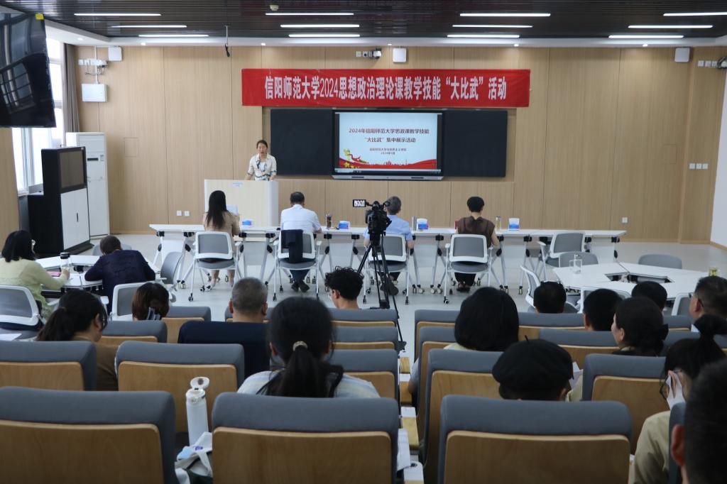 2024年思想政治理论课教学技能“大比武”活动在社科楼516举行。教务处等单位领导专家担任评委,学校专兼职思政课教师现场观摩学习。