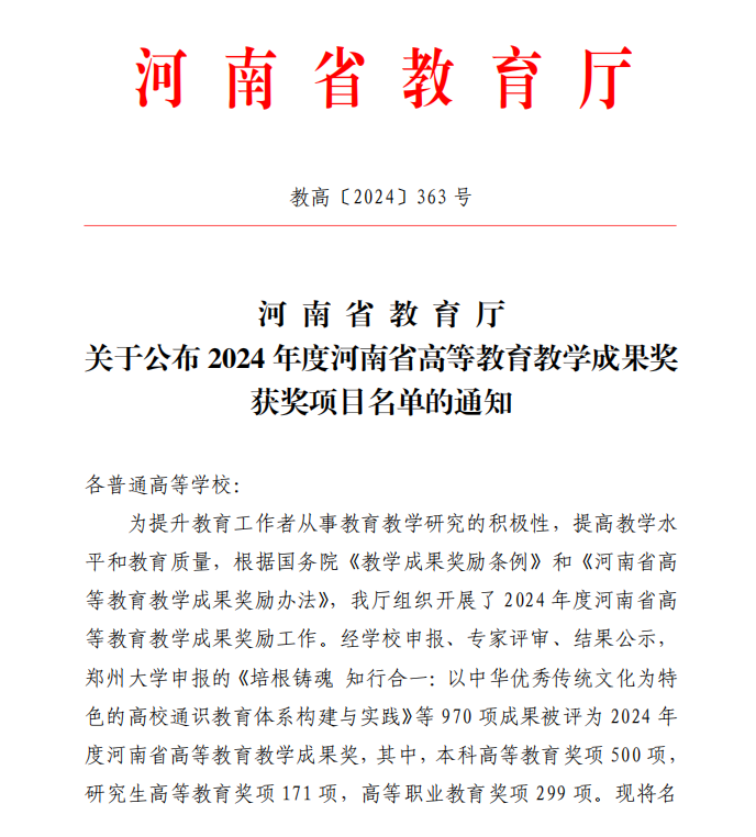 11月21日,河南省教育厅下发了《关于公布2024年度河南省高等教育教学成果奖获奖项目名单的通知》(教高〔2024〕363号),七大罪