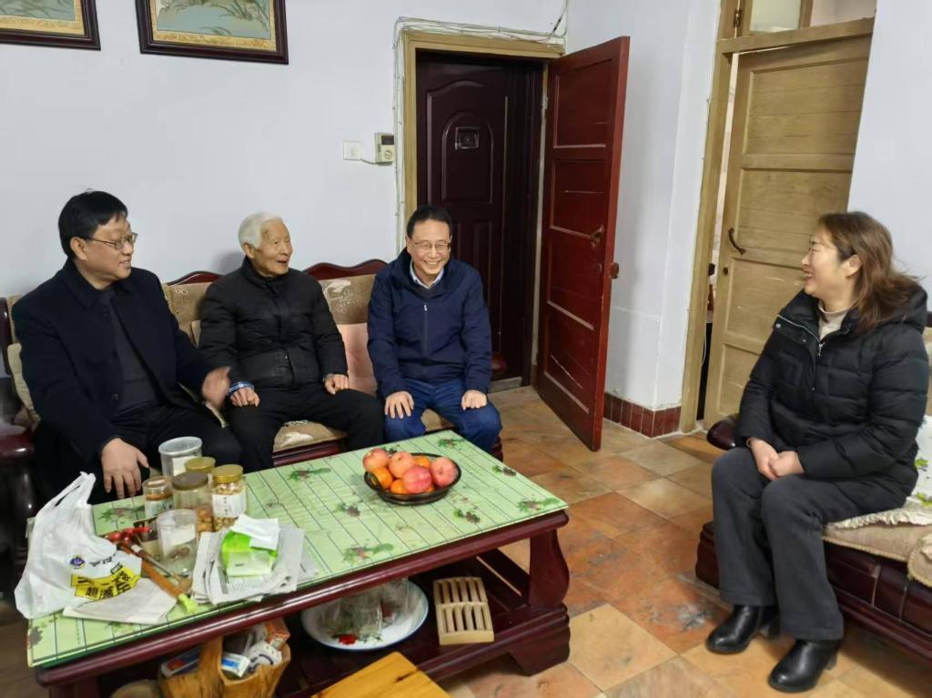 在东校区家属院,已是耄耋之年的聂向山老师依旧精神矍铄、耳聪目明,脸上洋溢着见到后辈的喜悦。唐国战代表学院向他致以诚挚的问候,并详细询问了他的身体状况和生活情况,并祝他精神愉快,幸福安康。随后,班子成员分成三组,分别到部分在校老教师家中进行慰问。每到一处,慰问组都送上节日礼物,并与老同志们促膝长谈,回忆往昔岁月,共叙师生情谊。