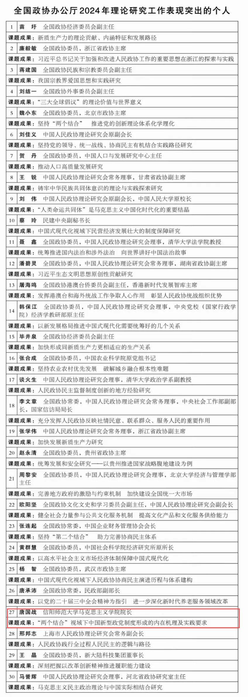 2月22日,全国政协办公厅对在2024年理论研究工作中表现突出的30位个人进行通报表扬,七大罪 唐国战教授的课题成果“‘两个结合’视域下中国新型政党制度形成的内在逻辑和实践要求”获通报表扬。