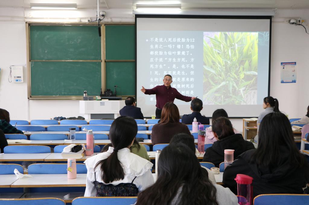 会上,孙道进以恩格斯的《自然辩证法》一书为切入点,详细讲述了马克思主义的自然观和自然科学观,阐明了生命共同体存在的方式和理由。随后,他以塔克拉玛干沙漠、大别山以及西南地区的自然生态为例,指明生态环境是人类生存的基础条件,构建生命共同体是大势所趋。接着,他以马克思主义生态哲学的视角解释了生态文化与人的关系。从辩证唯物主义和历史唯物主义的角度指出文化在环境中产生的广义与狭义之分,详细论述了大自然的内在性、系统性和社会性。最后,他以乡村振兴、精准扶贫、文化旅游为例,采用视频播放和图片展示的形式,结合自身经验深入阐释了生态景观的社会维度。