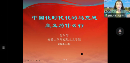 吴学琴教授深入浅出地阐释了党的二十大报告提出的“两个行”论断,指出马克思主义行在真善美、行在科学、行在世界影响力,中国化时代化的马克思主义行在为21世纪提供“道”与“理”、行在驾驭资本的能力。整场讲座展示出了理论分析的大智慧和大视野,同时强调将理论与实际联系起来,用马克思主义的世界观和方法论指导和解决实践问题,用习近平新时代中国特色社会主义思想铸魂育人。