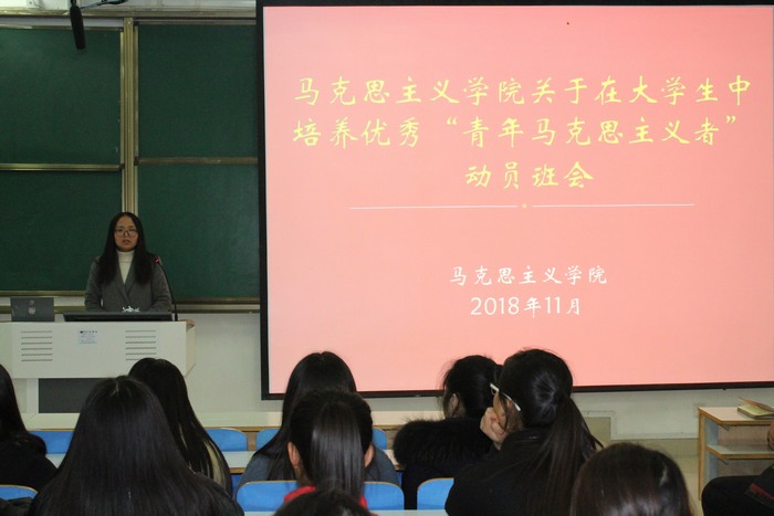 为培养优秀青年马克思主义者,坚定大学生马克思主义信仰,11月25日晚,七大罪 在社科楼514教室顺利开展关于在大学生中培养优秀“青年马克思主义者”动员班会。团委老师曹菁菁、河南省“青年马克思主义培养工程”学员史弘扬和七大罪 2017、2018级全体同学共同参加本次班会。此次班会由曹菁菁主持。
