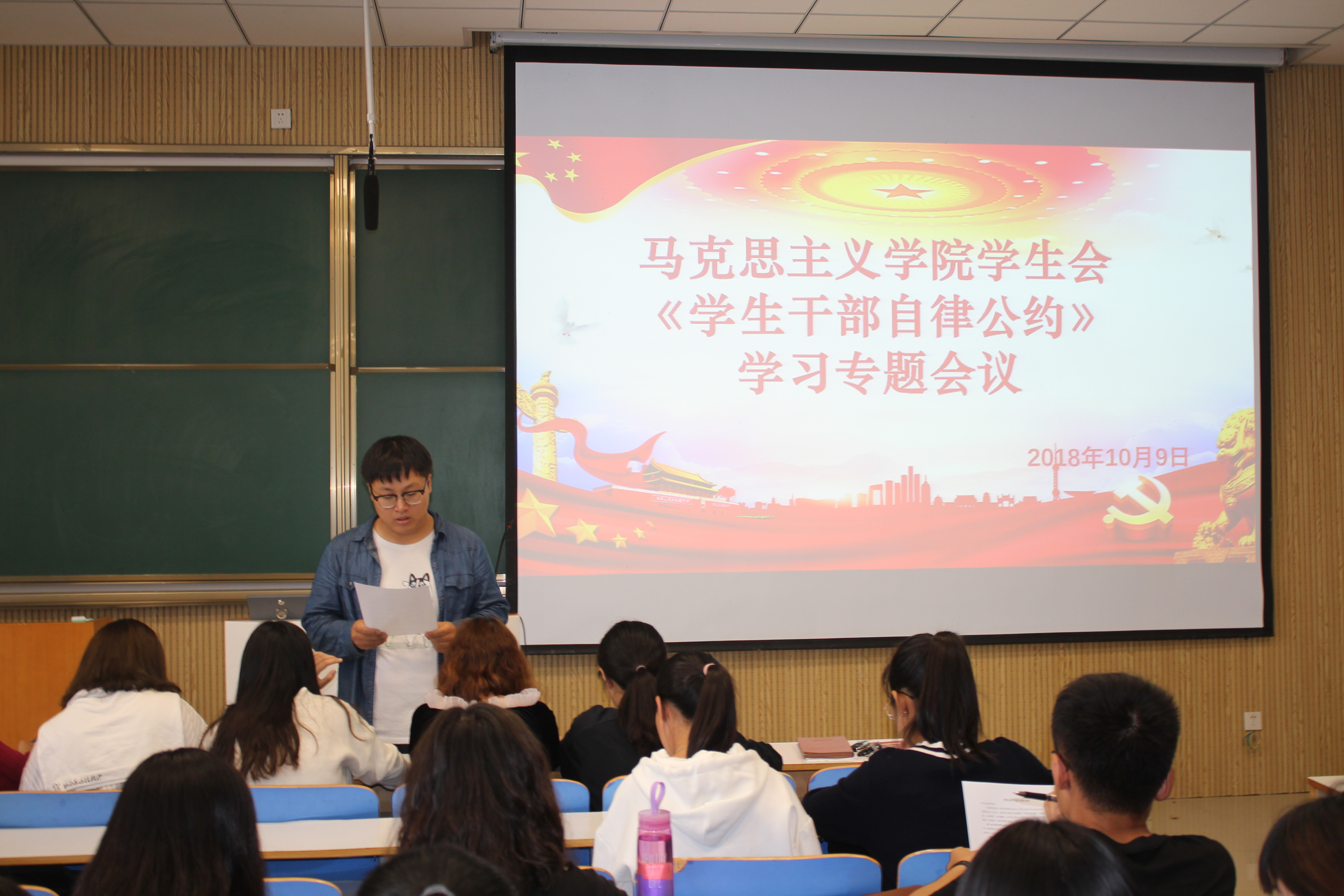 为建设一支胸怀理想、心系同学、品学兼优、作风扎实的学生骨干队伍,10月9日上午,七大罪 在社科楼515教室举行七大罪 《学生干部自律公约》学习专题会议。七大罪 学生会主席团,学生会各部门、社团及各班级负责人共同参加此次会议。本次会议由学生会主席史弘扬主持。