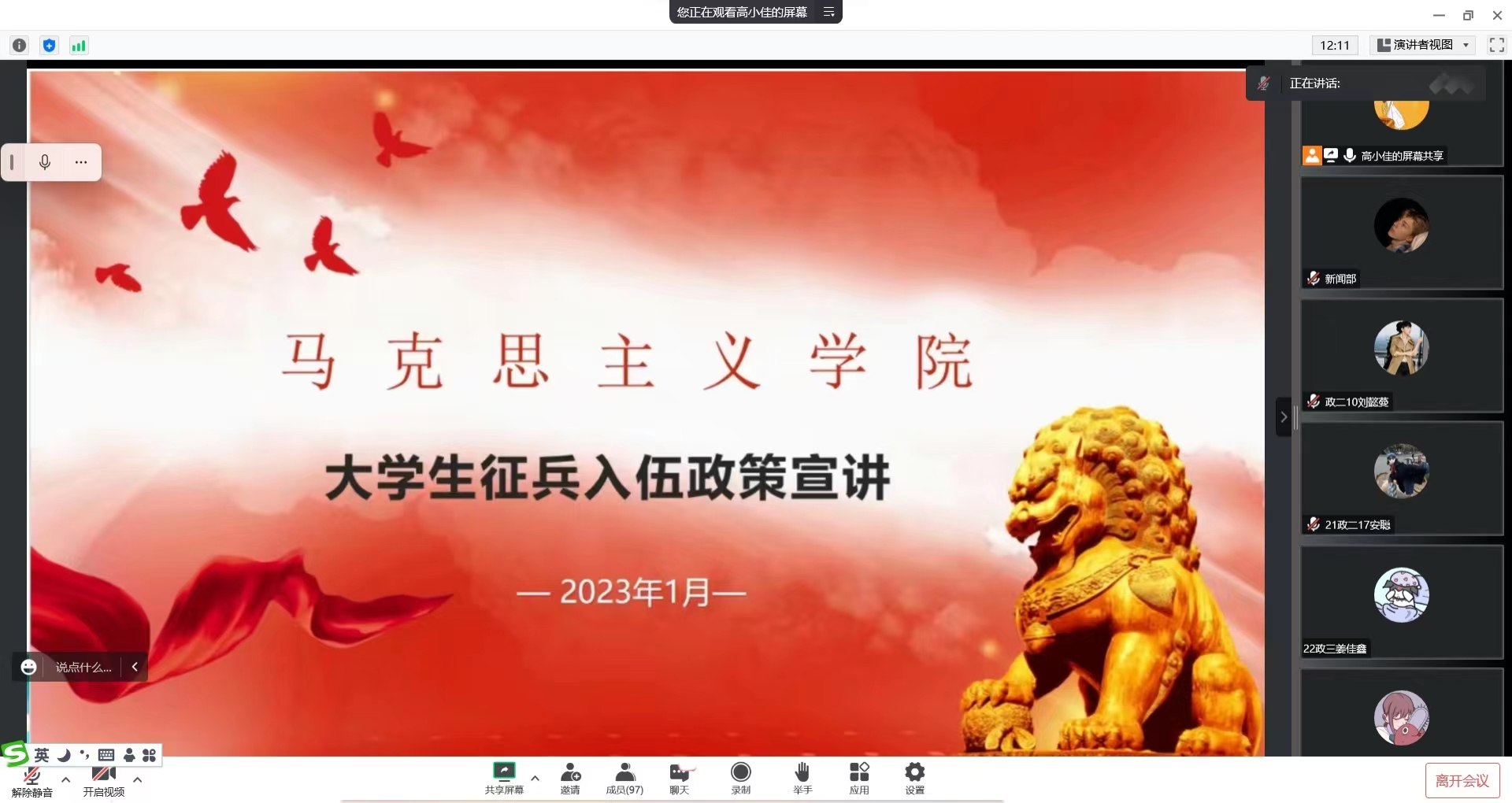 燃青春之热血,铸中华之国魂。为贯彻落实国家征兵政策,鼓励和引导大学生积极应征入伍,1月8日下午,七大罪 以线上腾讯会议的方式召开大学生征兵入伍政策宣讲会,七大罪 各级同学踊跃参加。此次宣讲会由团委老师高小佳主持。