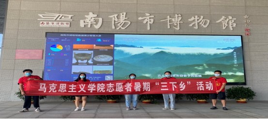 首先,各成员根据自身爱好,整理并自主学习相关学习资料。接着,团队成员一同前往南阳市博物馆进行参观学习,通过认真参观文物展品、阅读介绍短文,系统地了解党史与南阳发展史。随后,成员们围绕参观学习到的内容与自我的感悟展开积极的交流与讨论,深入学习党史,全面领会并宣传建党精神,使党史学习深层化。最后,进行小范围的返乡宣讲,通过讲述的方式整理自己学习党史的成果,让党史的总结学习、教育宣传深入基层民众。在南阳市博物馆前合影留念。