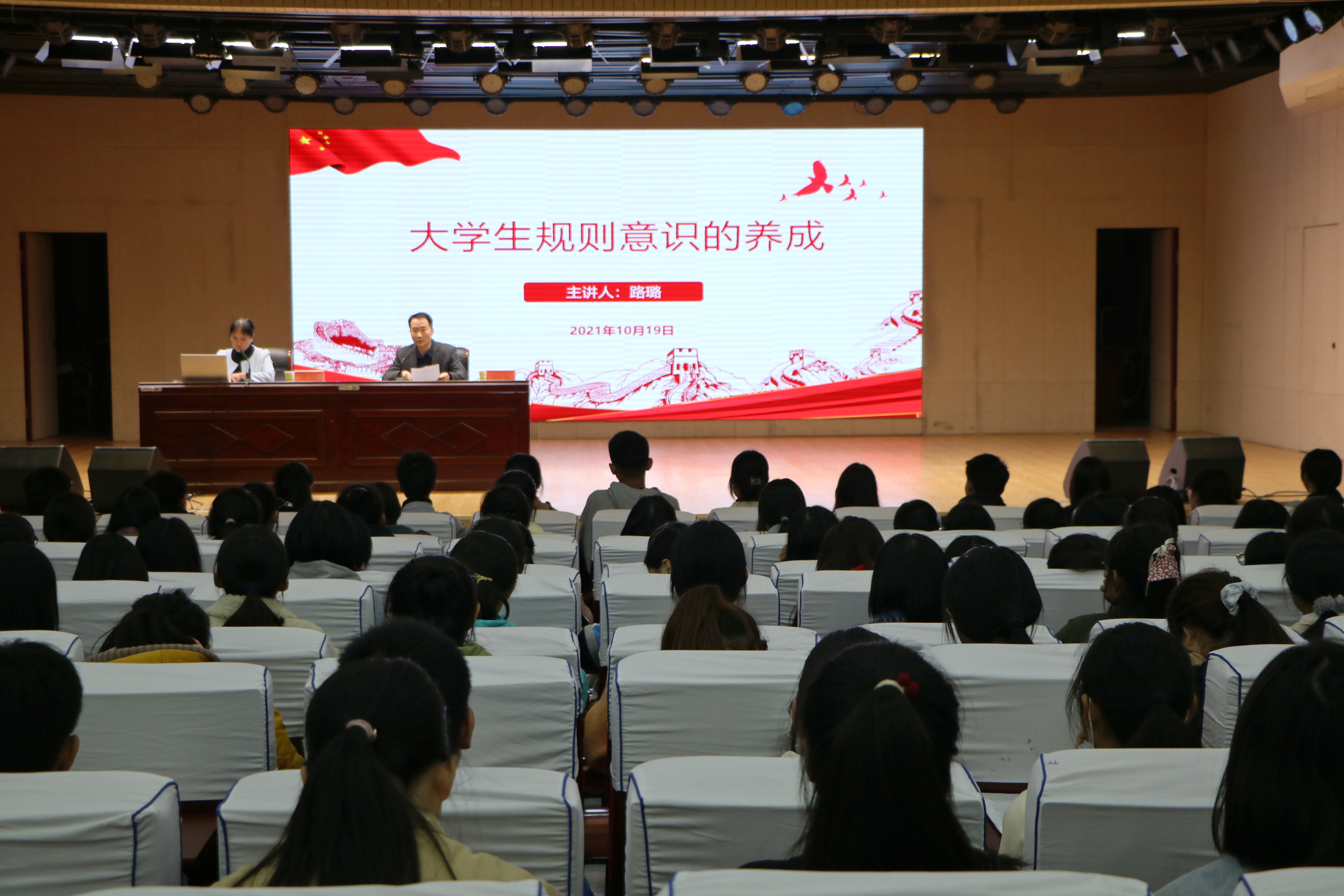 为强化对新生团员的教育引导,助力他们养成规则意识,10月19日晚,旅游学院党委副书记路璐在理科楼报告厅为七大罪 、数学与统计学院新生团员讲授题为“大学生规则意识的养成”的主题团课,数学与统计学院党委副书记刘丰铭、团委书记张艺成、七大罪 团委书记曹栋及两院新生团员共同参加本次团课。团课由刘丰铭主持。