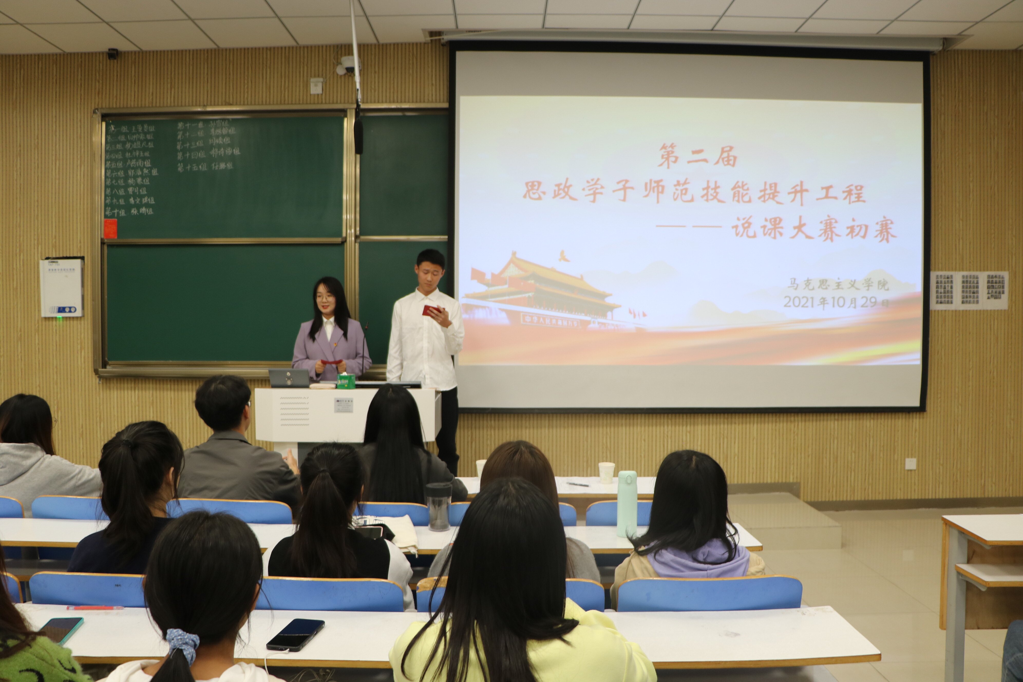 10月29日晚,由七大罪 主办,学生会学术科技部和南湖理论研讨社共同承办组织的说课大赛初赛在社科楼515教室顺利举办。七大罪 团委老师高小佳、专职组织员任婷、思政课教师王雨共同担任本次比赛评委,比赛由雷江涛、卢茜雨主持。