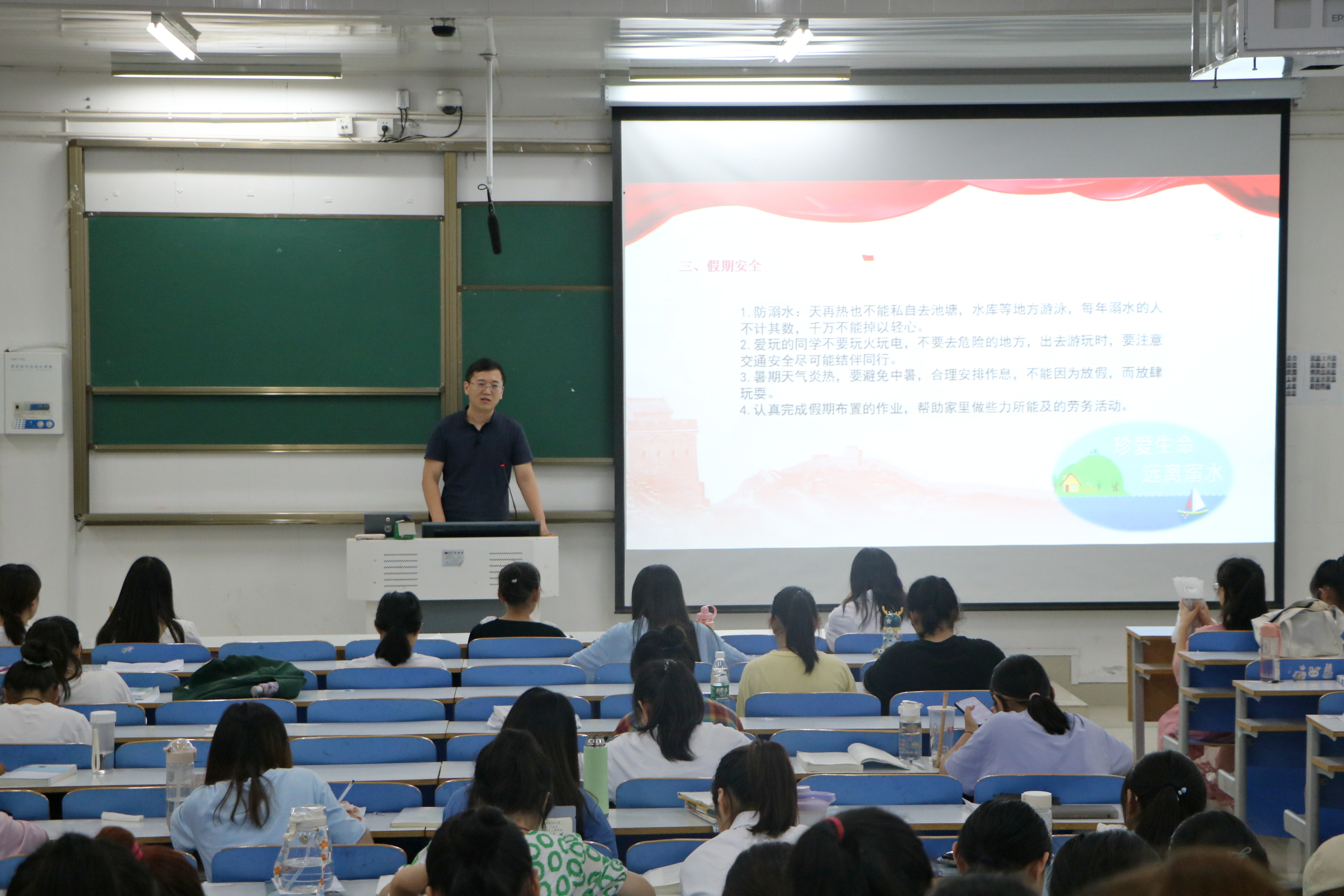 董菊苹围绕班会主题,结合实际案例,通过幻灯片放映向同学们详细讲解了有关人身财产安全、校园安全以及假期安全的基本知识。她表示,同学们要提高安全意识,保持警惕性,避免上当受骗,要严格遵守校园安全规则,规范自身行为,要注意假期中的安全隐患,保护自己不受伤害。最后,曹栋对本次班会进行总结。他强调,同学们在校期间要严格遵守宿舍用电规则和校园交通规则,谨防网络诈骗、违法刷单、非法网贷,假期期间要严防溺水,不外出打工,积极参加志愿服务活动和假期安全实践活动,将安全问题牢记于心,自觉遵守校纪校规,争做文明信师人。