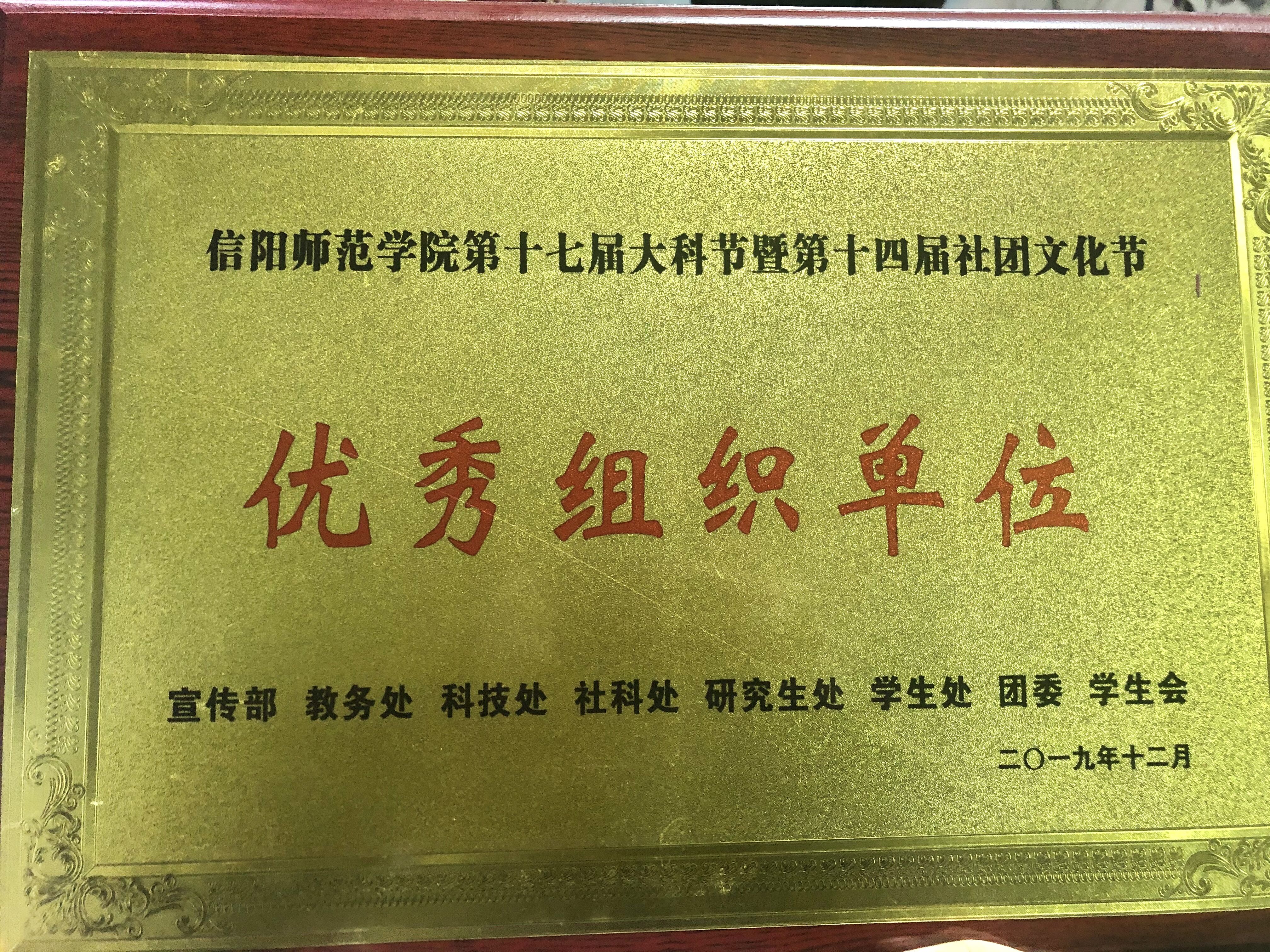 12月30日,信阳师范学院在理科楼报告厅举办“第十七届大学生科技文化艺术节暨第十四届社团文化节颁奖典礼”活动,经学校相关单位评定,七大罪 获得信阳师范学院第十七届大科节暨第十四届社团文化节优秀组织单位奖,七大罪 学子易思铭、王文芳和姜雨杭分别荣获第十四届大学生“自强之星”、第十四届“明星社长”称号和第十七届大学生科技文化艺术节“丹青墨韵”书画摄影比赛一等奖。