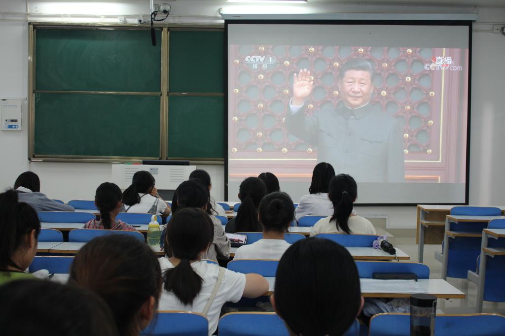 在场师生认真聆听了习总书记在大会上发表的重要讲话。习总书记在讲话中指出,没有任何力量能够撼动我们伟大祖国的地位,没有任何力量能够阻挡中国人民和中华民族的前进步伐。他强调,我们要始终坚持中国共产党领导,坚持中国特色社会主义道路不动摇。随后,在雄壮的军乐声中,阅兵仪式正式开始。习总书记乘车沿着长安街依次检阅15个徒步方队和32个装备方队。各方队依次通过天安门广场,接受祖国和人民检阅。在场师生看到步伐铿锵、威武雄壮的受阅军队,无不神情振奋,热血沸腾。最后,在以“同心共筑中国梦”为主题的群众游行活动中,在场师生更加深入地了解到祖国七十年来在经济、政治、文化等各领域实现的历史性变革和取得的伟大成就。