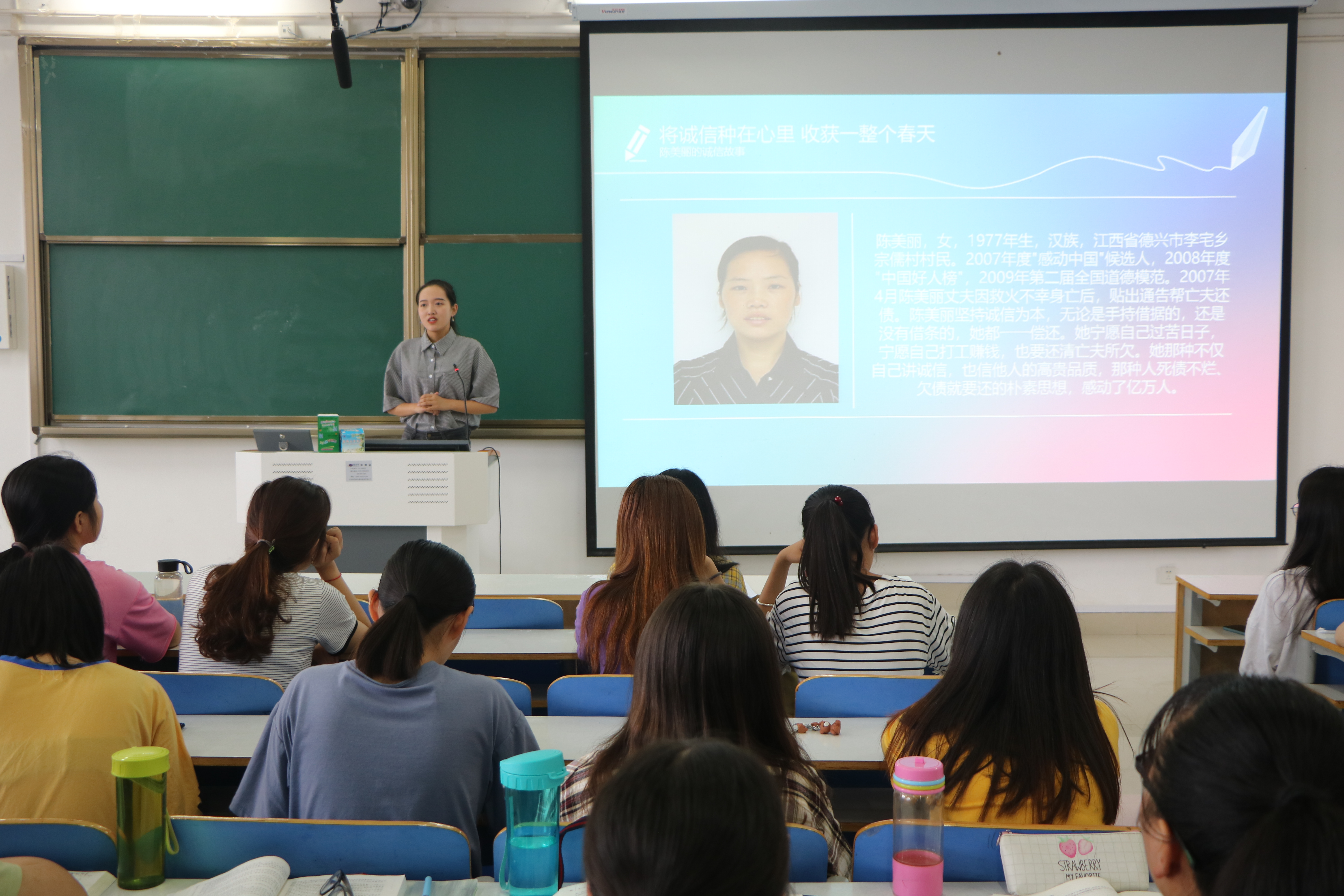 黄子晋以“将诚信种在心里,收获一整个春天”为主题,向同学们讲述了2009年第二届全国道德模范陈美丽宁愿自己打工赚钱过苦日子也要替夫还债的故事。她认为,陈美丽坚持诚信为本的高尚品质值得我们每个人学习。