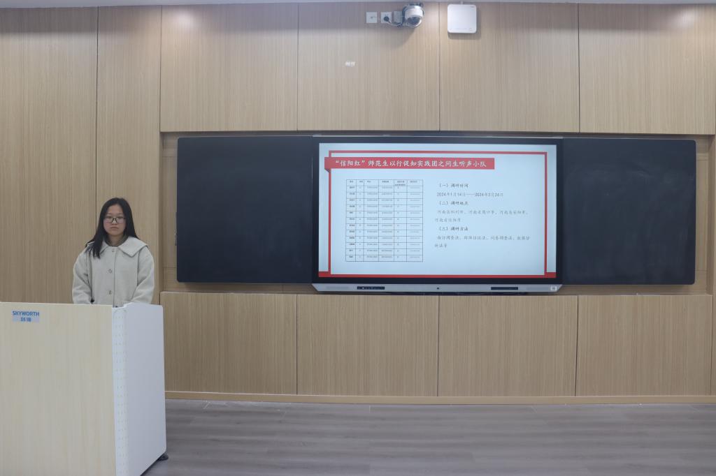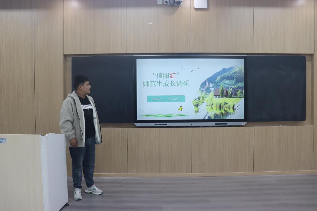 会议伊始,杨可介绍了本次“信阳红”师范生成长调研活动的宗旨和意义。接着,五组代表依次上台进行汇报演讲。调研小组多通过同资深教师对话、交流等形式加强自身对教师素养、教师水平、教师情怀等方面的理解,结合实践调研经验深度剖析师范生在教育实践中遇到的困难挑战并提出针对性建议。其中“问生听声”小组采取线上调查问卷、线下访谈相结合的调研方式,从采访师范生这一角度切入,对三所学校二十多位不同年级的在读师范生展开座谈,并在中期实践中采取“一对多”的对话模式引导同学们进行思想碰撞,推动理论知识转化为实际应用能力。