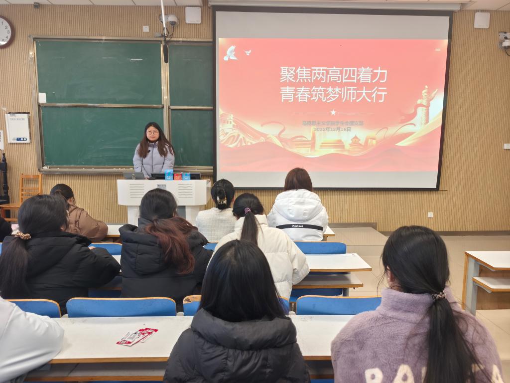团课伊始,张甜甜围绕“两高四着力”的核心要义展开讲解,结合师范院校立德树人的办学宗旨与思想政治教育专业经世致用的学科特点,深入剖析其对青年学子成长成才的理论指引与实践价值。她通过鲜活的模范案例分析、热烈的小组互动交流等方式,将抽象的理论知识与具体的校园生活、明晰的职业规划紧密结合,引导同学们思考如何以“两高四着力”为行动指南,在专业学习中深耕细研、锤炼过硬本领,在社会实践中躬身实干、增长综合才干,立足师大校园这片沃土筑牢信仰之基与理想根基。团课最后,张甜甜鼓励全体成员将“两高四着力”的要求内化于心、外化于行,以青春之我、奋斗之我为学校高质量发展贡献青春力量,在新时代的壮阔征程中书写属于青年一代的使命担当。