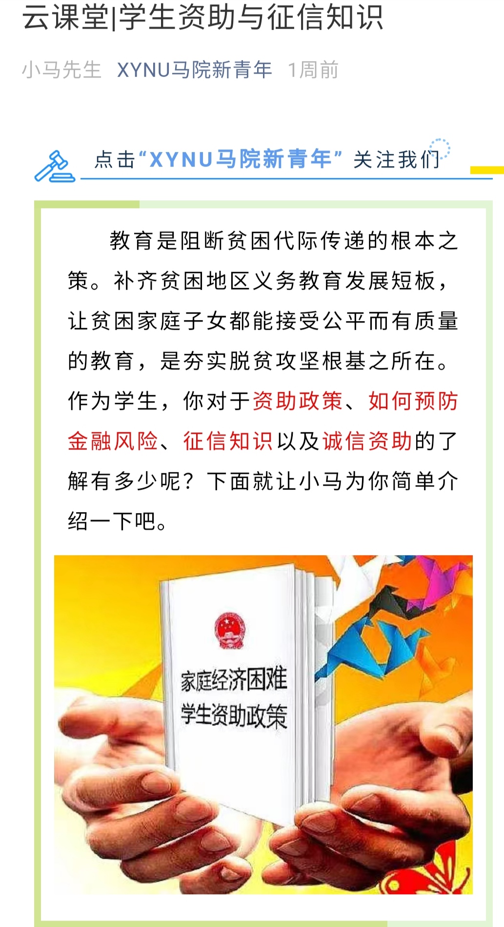 6月15日,学贷部与新媒体合力推出《云课堂|学生资助与征信知识》微信推文,让大家对河南省学生资助政策、金融征信知识进行广泛地学习。经过前期的精心准备,学贷部收集整理知识材料,由新媒体搭配图文并辅以相关学习视频制作成微信推文。推文从学生资助政策、防范校园贷,远离金融风险、征信小知识、向“诚信之星”学习四方面为学生呈现出一堂内容丰富、形式活泼、贴近生活的“云课堂”,使学生在资助与征信知识学习中受益匪浅。