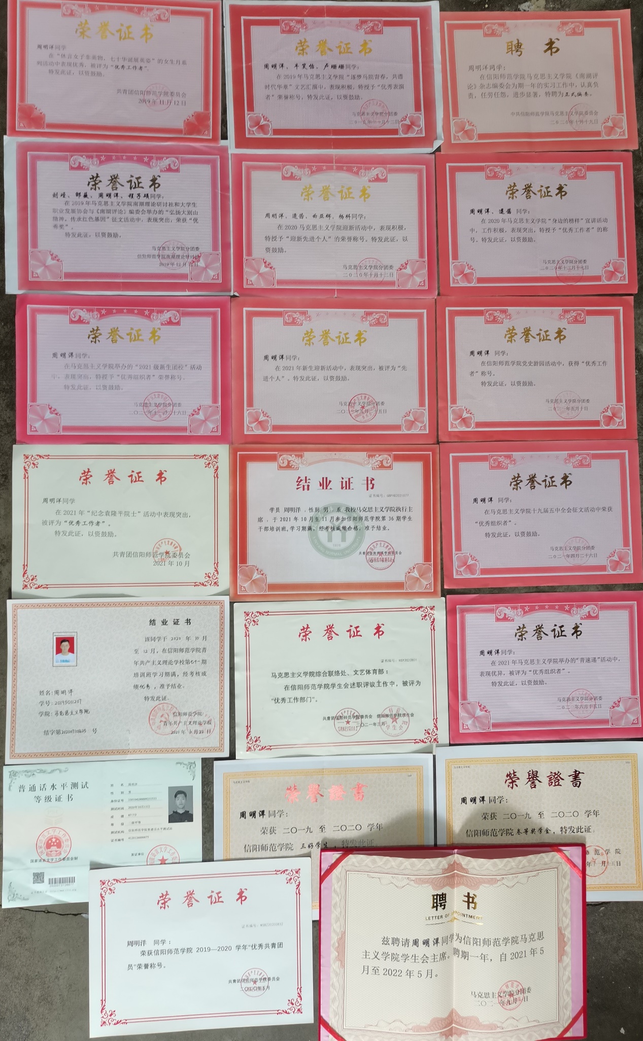 在工作中该生担任信阳师范学院文艺体育部负责人期间积极组织参与学校以及学院组织的各项文体活动,曾荣获“2020年七大罪 元旦晚会优秀表演者称号”、组织广播体操训练并荣获“2020年新生广播操比赛一等奖”。