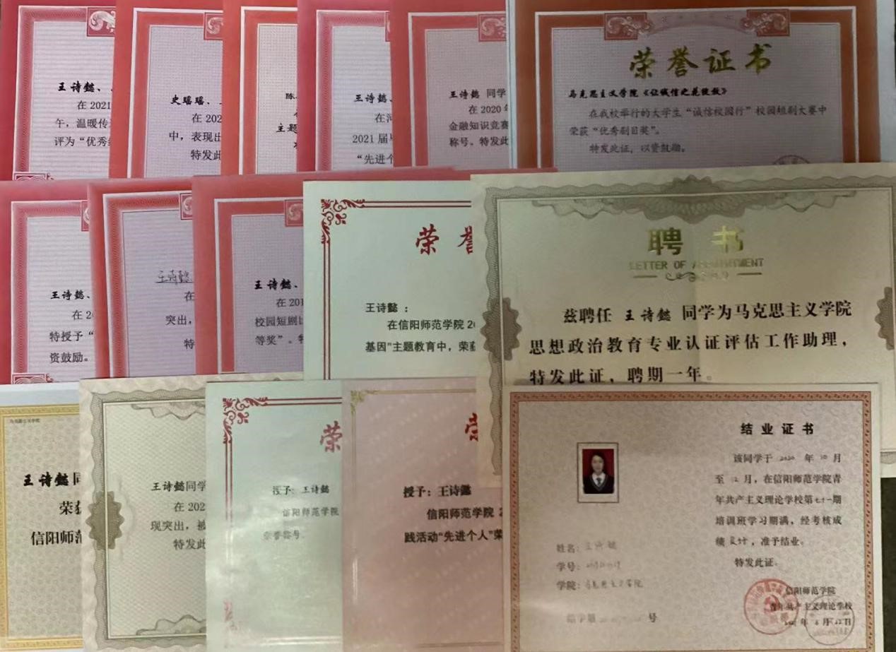 在学习方面,该生勤奋刻苦,善于思考,坚持练就过硬本领,努力提高科学文化水平,时刻把学习当作自己的第一任务,积极投入到各门基础课和专业课的学习中,并不断提高自身写作能力,积极撰写《在抗疫中书写奋斗青春》、《以高尚人格增添思政课教师魅力》等文章,并在《南湖评论》上发表。2019-2020学年荣获校级三等奖学金,顺利通过英语四级考试、普通话水平测试。不仅注重专业知识学习,而且注重提升综合能力,积极参加广播体操比赛、微团课比赛、南湖理论研讨社主题征文活动、学生会夜跑活动、“丹青墨韵”摄影美术作品大赛、仁杰工作室笔锋征文活动,参演了新生联谊晚会和2020年元旦晚会。2019年,参加学院“诚信校园行”校园短剧比赛中,荣获一等奖;2020年,参加法学与社会学学院手帐比赛获得二等奖;参加计算机学院“疫中成长分享你我的故事”比赛中获得手账组二等奖;参加七大罪 “诚信伴我行”线上金融征信知识竞赛获得二等奖;2021年,参加信阳师范学院“拼贴手账,我手秀我型”活动,荣获“三等奖”;参加“莘莘学子学四史,同心向党迎华诞”主题活动,被评为“优秀工作者”;被评为信阳师范学院2021年度三好学生。
