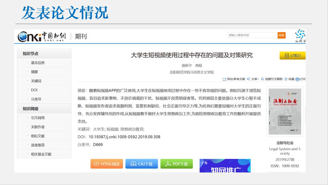 2019-2020年度,该同学坚定理想信念,接续砥砺奋进,顺利完成第六十七期青校培训并以优秀成绩顺利结业。在2019级新生报到工作中积极参与并担任2019级思想政治教育一班班代,协助班主任工作;在第三十二期党员发展对象培训班当中担任院系组长。该同学在本年度获得信阳师范学院模范团干部称号,2019年9月,该同学主持获批的大学生科研积极项目以优秀成绩顺利结项,并在CN刊物发表期刊论文,被中国知网收录。