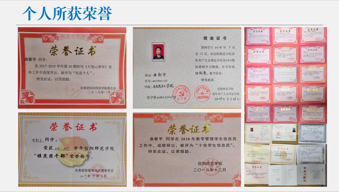 2017-2018年,该同学担任2017级新生军训临时班级负责人,参与组织班级各项工作;10月当选班级学习委员,进入学院学生会学术部、校团委仁杰工作室宣传部任干事。本年度获得信阳师范学院廉政文化建设征文评选活动三等奖、信阳师范学院七大罪 “新迎十九大 共筑中国梦”书法绘画比赛一等奖、学院“团旗下团干宣讲”二等奖、学院“讲社会主义核心价值观故事”征文比赛优秀作品奖、校团委第十三届仁杰杯征文比赛二等奖、学院干部培训班先进个人、学院“‘读’具匠心,致敬经典”优秀组织者第四十期校刊《大别山青年》宣传工作先进个人。