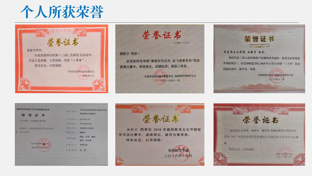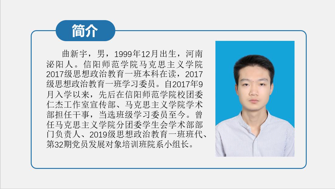 曲新宇,男,汉族,河南省泌阳县人,2017级思想政治教育一班学生,任2017级思想政治一班学习委员。