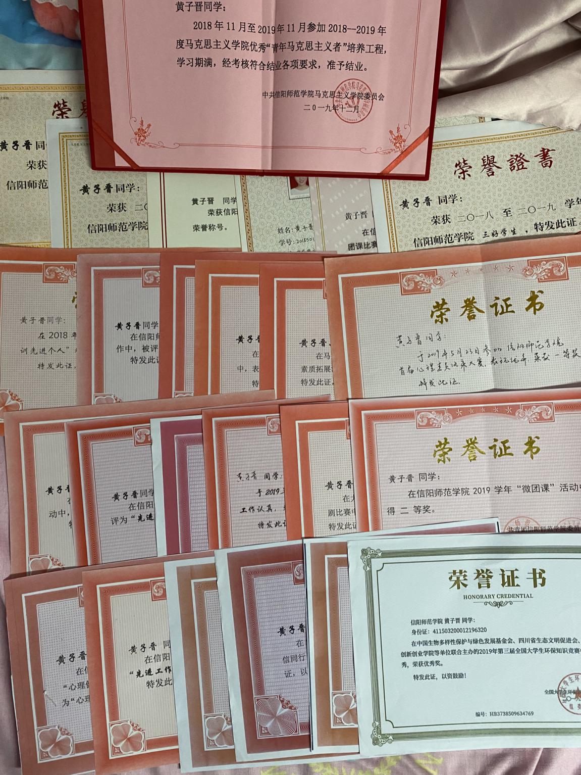 发扬红色精神。积极参加学校和学院举办有关红色精神方面的活动,在2018、2019年度共青团信阳师范学院委员会主办的“乘新时代东风,放飞青春梦想”微型团课比赛中荣获二等奖、在七大罪 “诚邀你我 与信同行”演讲比赛中荣获一等奖,在“讲价值观故事”活动中被评为“优秀工作者”。